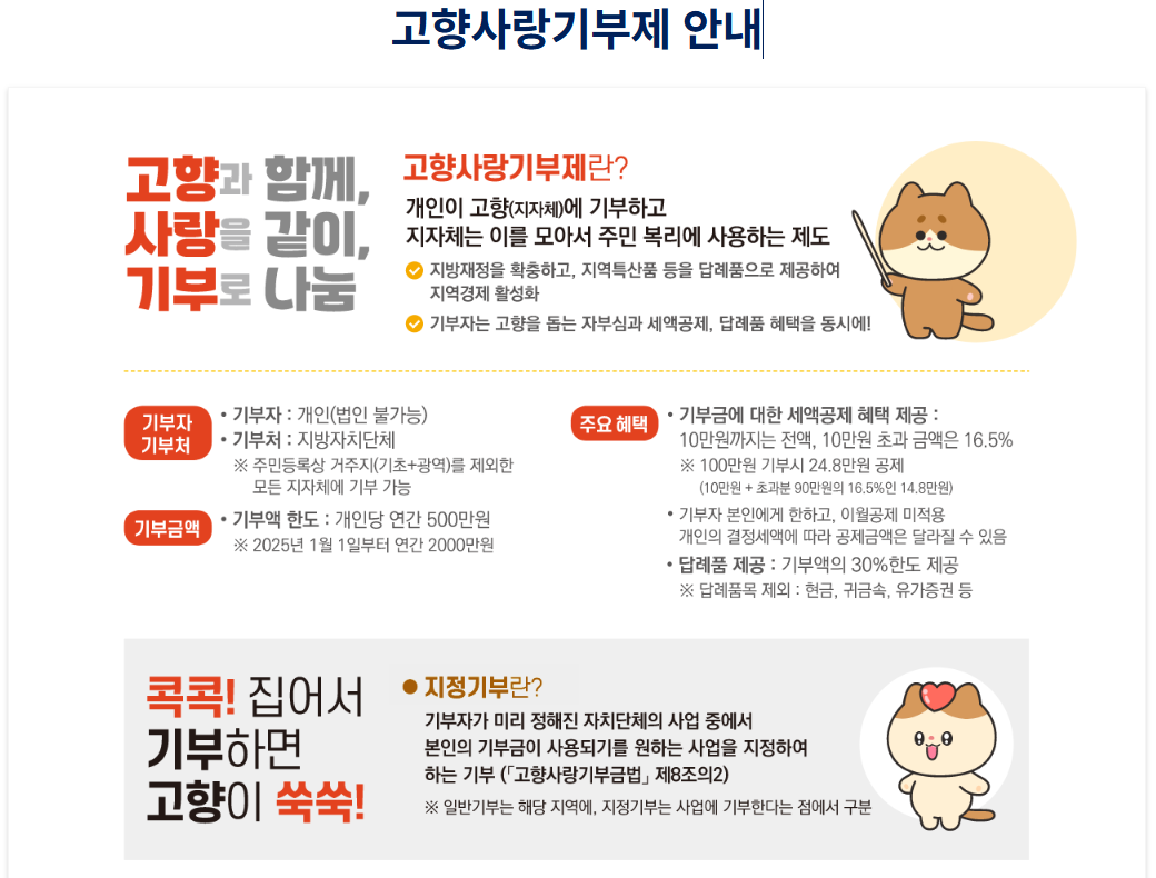 이상으로 고향사랑기부제에 대한 상세한 안내를 마칩니다. 기부를 통해 고향과 지역사회를 응원하고, 다양한 혜택도 함께 누려보세요.