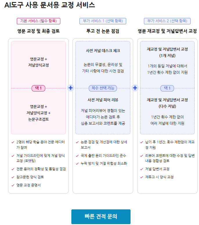 에디티지의 서비스를 이용하면서 느낀 점은, 단순한 교정 업체가 아니라 연구자에게 꼭 필요한 종합 학술 지원 플랫폼이라는 거예요. 제가 특히 감명받았던 몇 가지를 정리해볼게요.