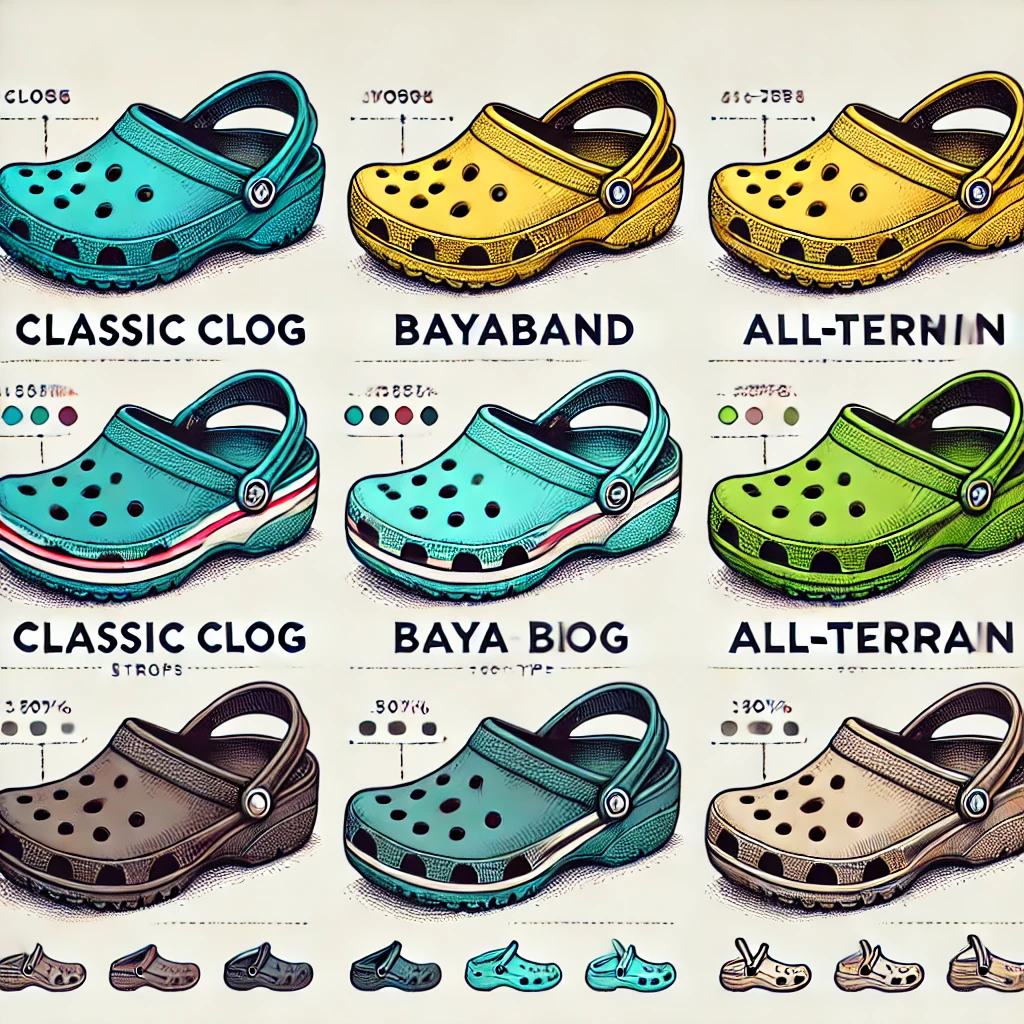 크록스에는 클래식 클로그, 바야밴드, 올터레인 등 여러 모델이 있으며, 각 모델마다 고유한 기능과 디자인이 있습니다.
