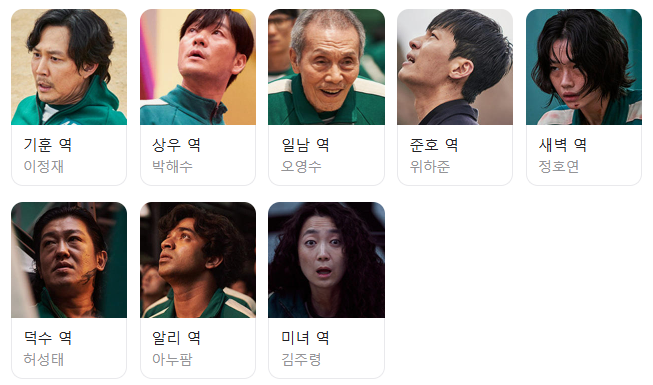 | 기훈 (성기훈) | 이정재 | 빚에 쫓기는 참가자로, 인간적인 면모와 책임감을 보여줌. |
